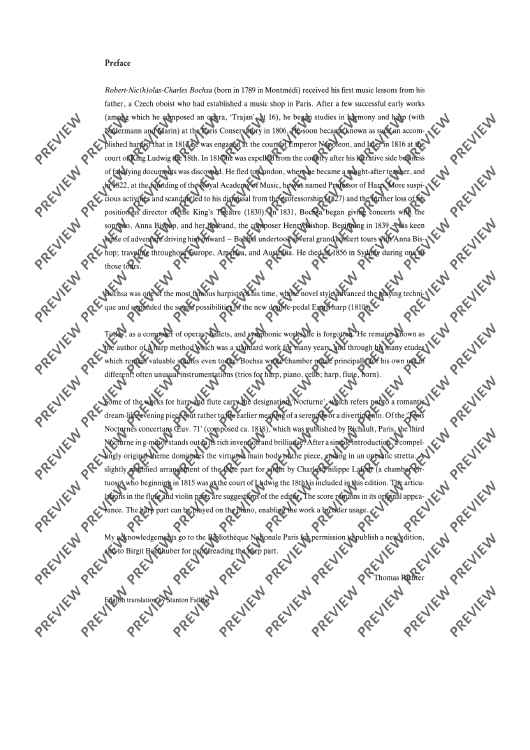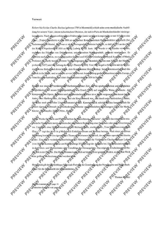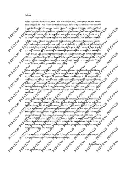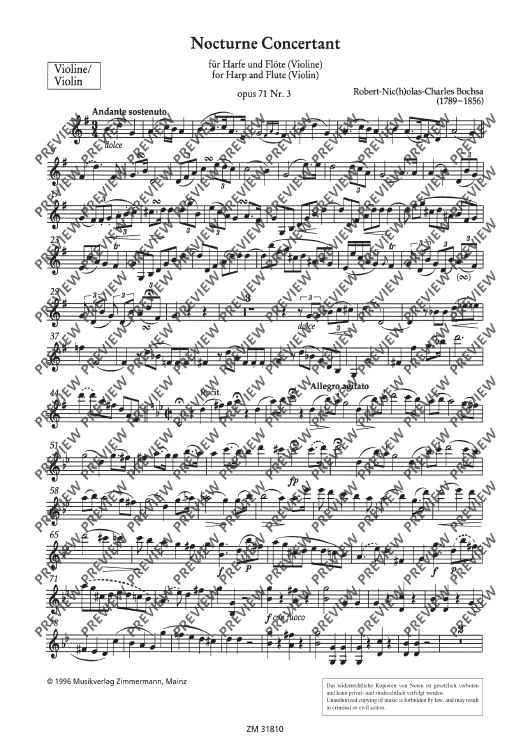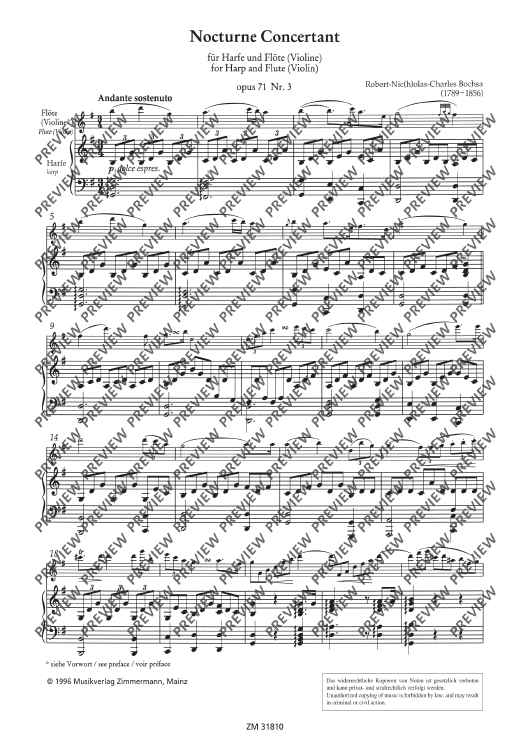 Bochsa, born in 1789, was a harpist and in 1813 he was engaged at the court of Emperor Napoleon and later at the court of King Louis XVIII. In 1822, at the founding of the Royal Academy of Music, he was named Professor of harp. In 1831 he began giving concerts. Bochsa expanded both the playing techniques and the sound possibilities of the new double-pedal Erard harp. He mainly composed pieces for his own instrument and for his concert tours.The nocturne presented here was written around 1818. The violin part was done by his contemporary, the chamber virtuoso Charles Philippe Lafont. Thus the new edition offers both possibilities of performance. The harp part can also be played on the piano.
