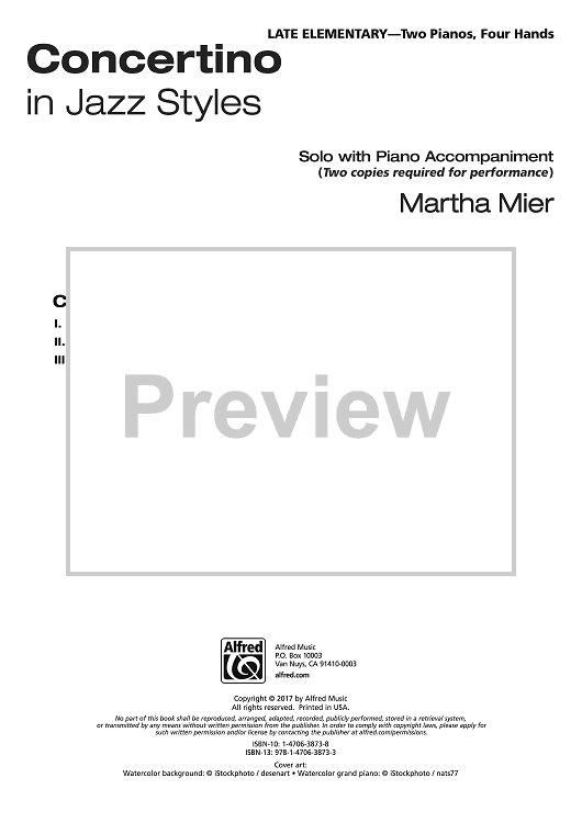 Pianists at the late elementary level will experience a variety of jazz rhythms and styles in Martha Mier's Concertino in Jazz Styles. The first movement features a lyrical melodic line in the solo part accompanied by syncopated rhythms and seventh-chord harmonies in the accompaniment. The second movement is a jazz waltz, while the third movement captures the feeling of a jaunty walk with its uneven eighth notes. This concertino provides a refreshing introduction to elements of jazz and is a welcome addition to concertos for late elementary students.