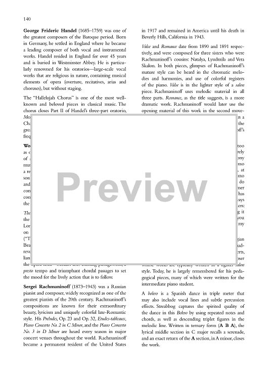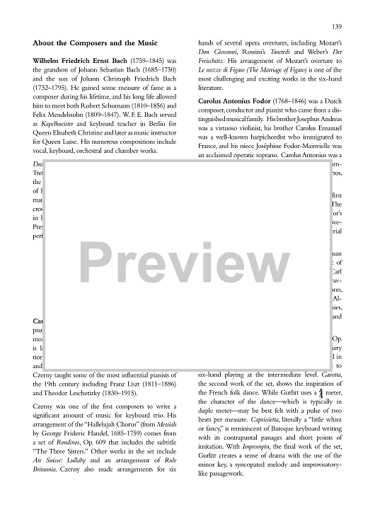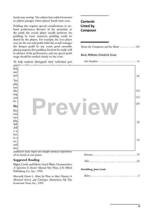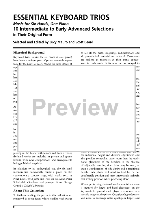 Keyboard trios (three pianists at one keyboard) are not only an enjoyable form of ensemble music, but are also indispensable tools in developing rhythm, dynamics, tempo consistency, and group musicianship skills in any pianist. The original works of W. F. Bach, Fodor, Gurlitt, Handel, Mozart, Rachmaninoff, and Streabogg are included, in score format (with all three parts on the same page), along with essential performance notes and helpful editorial fingerings and footnotes.