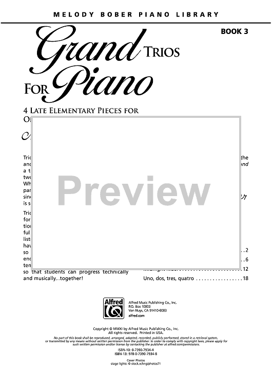 The joy of ensemble playing with six hands at the piano is captured in this series of trios by educational music author Melody Bober. Written for pianists at the early-intermediate level, the pieces in this collection expand the reading range and technical level. All three parts are equal in difficulty. A variety of keys, styles, meters, and tempos are featured. Titles: Harvest Time Rag * Irish Circle Dance * Snap, Clap, Boogie * Unsolved Mystery.