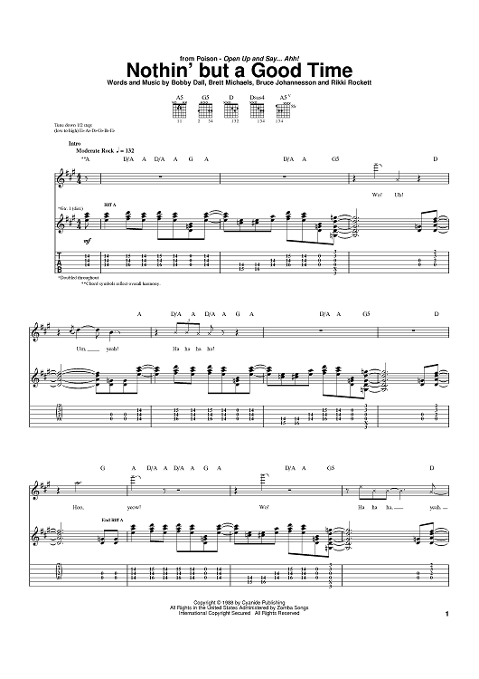 Digital Sheet Music for Nothin' But A Good Time by Poison, Bobby Dall, Rikki Rockett, C. C. DeVille, Brett Michaels scored for Guitar Tab; id:394070