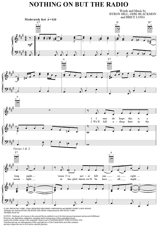 Digital Sheet Music for Nothing On But The Radio by Byron Hill, Gary Allan, Odie Blackmon, Brice Long scored for Piano/Vocal/Chords; id:307661