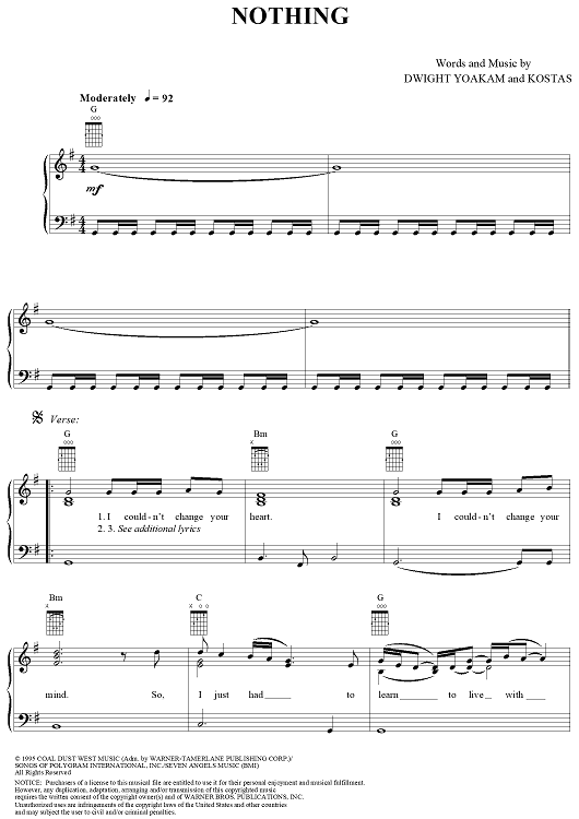 Digital Sheet Music for Nothing by Kostas, Dwight Yoakam scored for Piano/Vocal/Chords; id:262701