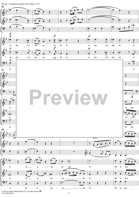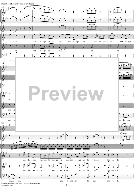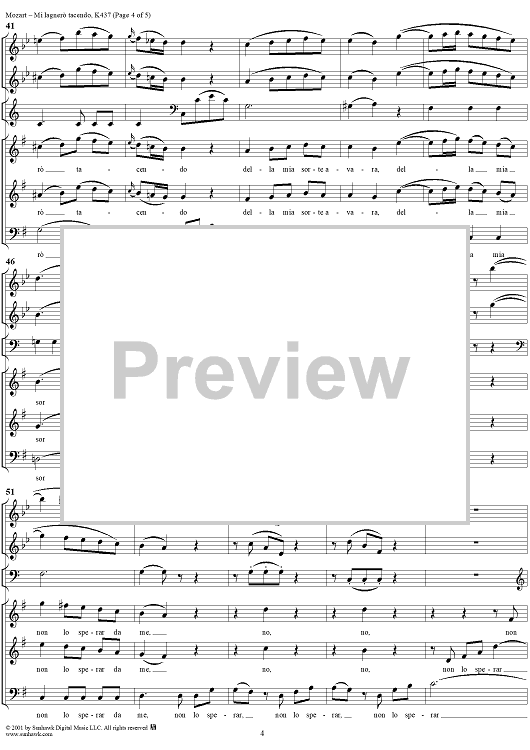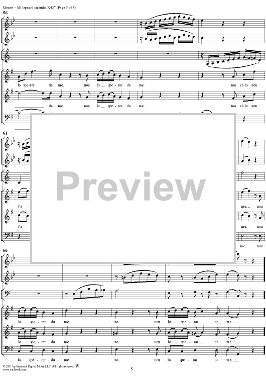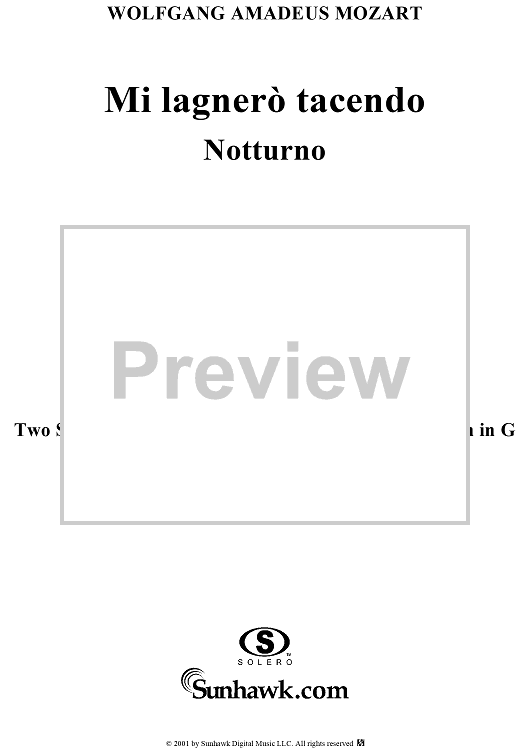 Digital Sheet Music for Notturno: "Mi lagnerò tacendo", K. 437 - Full Score by Wolfgang Amadeus Mozart scored for 2 Sopranos/Bass/2 Clarinets/Basset Horn; id:242049