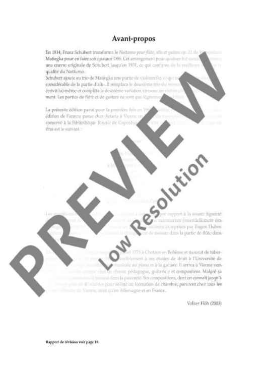 Wenzeslaus Thomas Matiegka wurde am 6. Juli 1773 in Chotzen (Böhmen) getauft und starb am 19. Januar 1830 in Wien. Neben seinem Jurastudium an der Prager Universität erhielt er eine musische Ausbildung auf dem Klavier und der Gitarre. Um 1800 kam er nach Wien, wo er sich als Chordirigent und Pädagoge, als Gitarrist und Komponist betätigte. Trotz großer musikalischer Anerkennung starb er in ärmlichen Verhältnissen. Seine Kompositionen - bekannt sind bisher über 40 Werke der Solo- und Kammermusik - erschienen in allen großen Wiener Verlagshäusern sowie in Deutschland und Frankreich. Das Notturno op. 21 ist heute vor allem deshalb bekannt, weil es als Vorlage für die Quartettbearbeitung D96 von Franz Schubert diente, der dem Trio eine zusätzliche Cellostimme hinzufügte. In der vorliegenden Neuausgabe wurde der Notensatz der Ausgabe von 1960 übernommen, Fehler wurden korrigiert und das Layout leicht modernisiert. Neu sind ein Vorwort und ein Revisionsbericht.