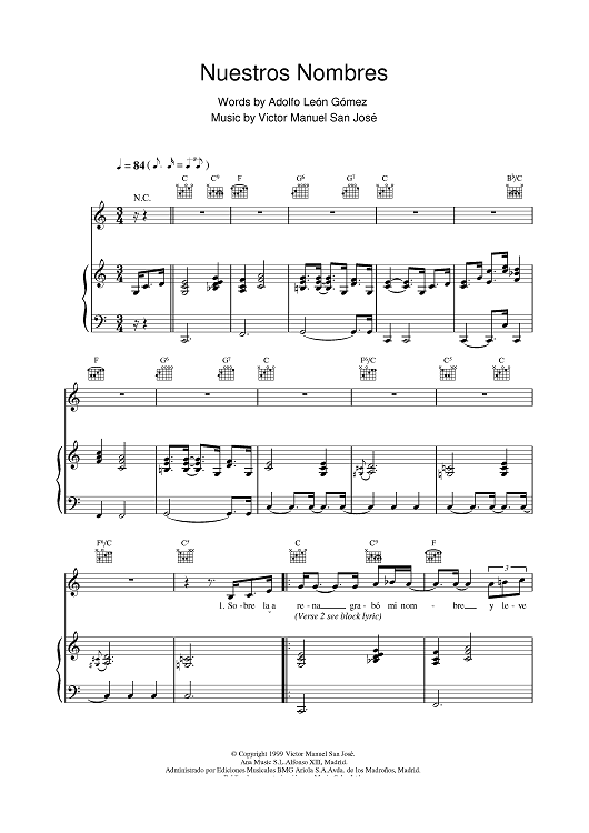 Digital Sheet Music for Nuestros Nombres by Adolfo Leon Gomez, VictorTierra Mia Manuel San Jose scored for Piano/Vocal/Chords; id:379969