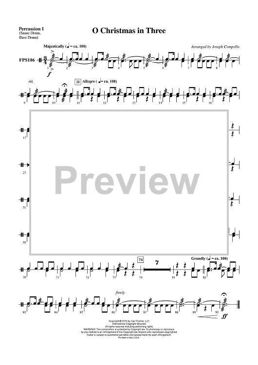 Digital Sheet Music for O Christmas in Three - Percussion 1 by Joseph Compello, Traditional Carols scored for Concert Band; id:435882