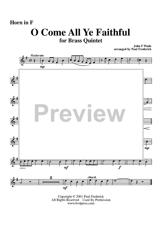 Digital Sheet Music for O Come All Ye Faithful - Horn in F by , John Francis Wade, Paul Frederick scored for Brass Quintet; id:314076