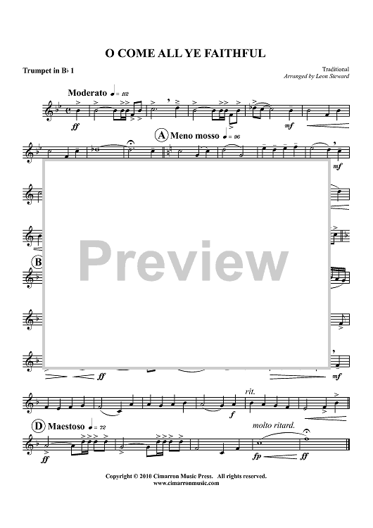 Digital Sheet Music for O, Come All Ye Faithful - Trumpet 1 in Bb by , Traditional, Leon Steward scored for Brass Quintet; id:416699