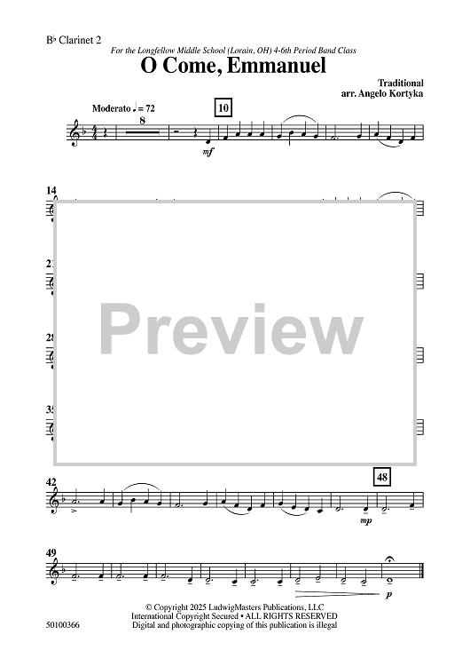 Digital Sheet Music for O Come, Emmanuel - Bb Clarinet 2 by Traditional, Angelo Kortyka scored for Concert Band; id:509329
