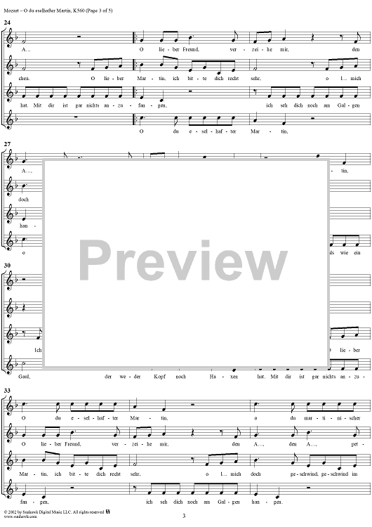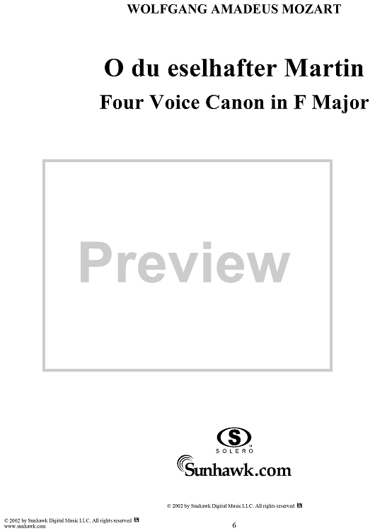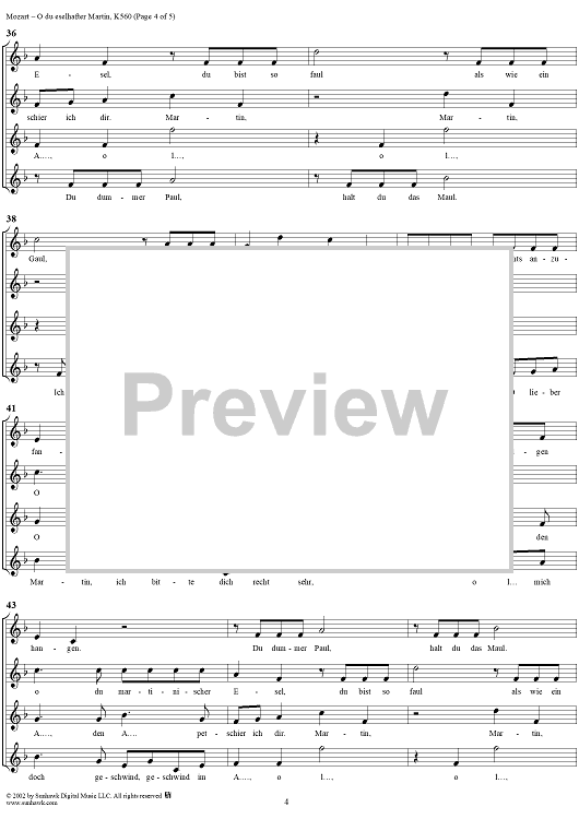Digital Sheet Music for O du eselhafter Martin, four voice canon in F Major, K560 by Wolfgang Amadeus Mozart scored for Four Sopranos; id:291159