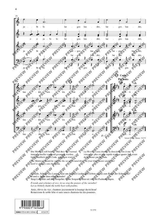 Commissioned for the International Choral Festival 'Europa cantat', this little cheerful madrigal was written in 2006 by the composer Enjott Schneider (*1950) from Munich. The Latin text ('Trinklied' from 'Carmina Burana') and the piece's easy singability should ensure its wide circulation. Suited as an encore piece or for cheerful programmes. Feasible for amateur and youth choirs as well.