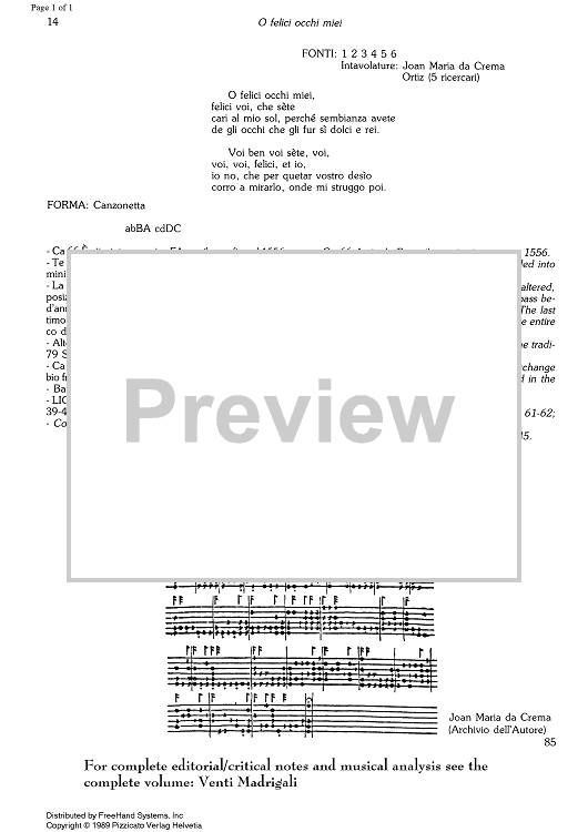 "O felici occhi miei from 20 Madrigali - Notes" Sheet Music by Jacques Arcadelt