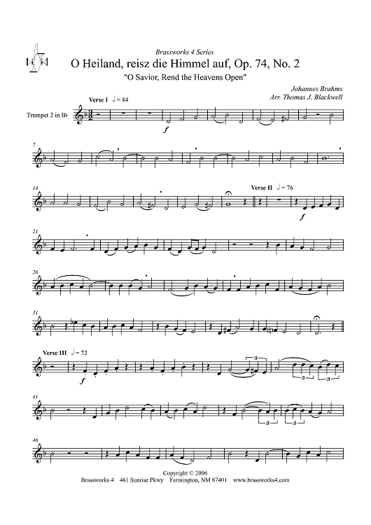 Digital Sheet Music for O Heiland, reisz die Himmel auf, Op. 74, No. 2 - Trumpet 2 in B-flat by Johannes Brahms, Thomas J. Blackwell scored for Brass Quartet; id:360892