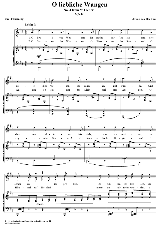 Digital Sheet Music for O Liebliche Wangen by Johannes Brahms, Paul Flemming scored for Voice/Piano; id:118350