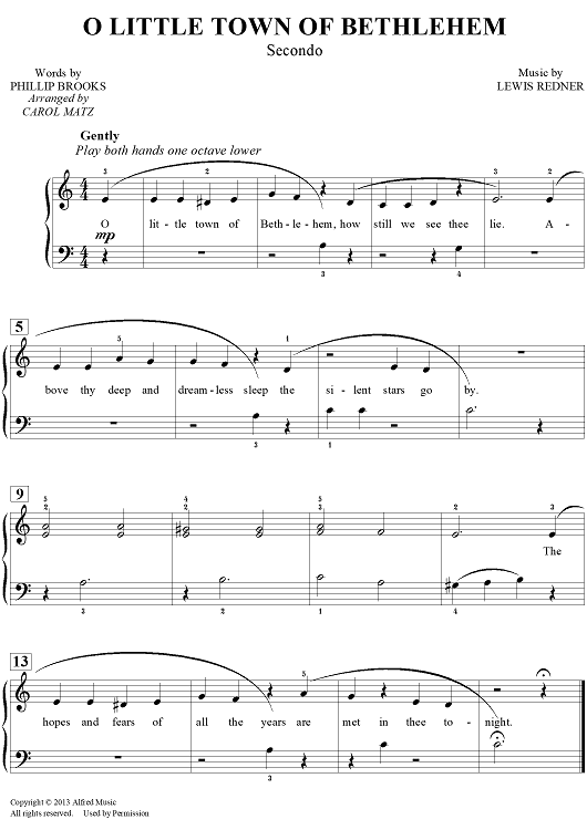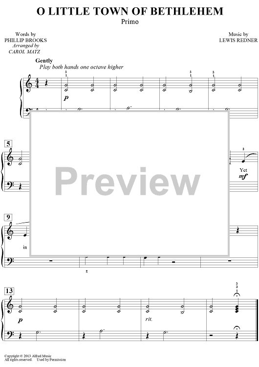 Digital Sheet Music for O Little Town of Bethlehem by Phillips Brooks, Lewis H. Redner, Carol Matz scored for 1 Piano, 4 Hands; id:454156