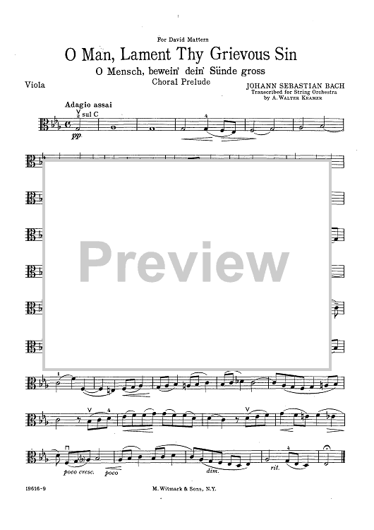 Digital Sheet Music for O Man, Lament Thy Grievous Sin (O Mensch bewein dein' Sünde Gross) - Viola by , Johann Sebastian Bach, A. Walter Kramer scored for String Orchestra; id:427895