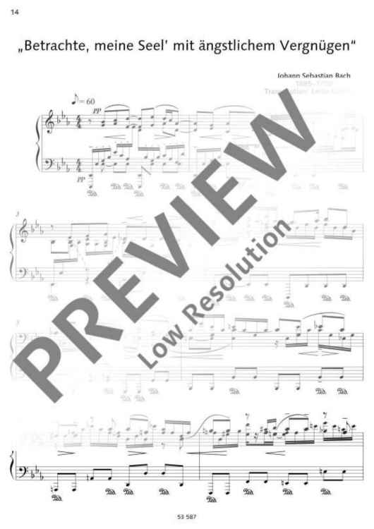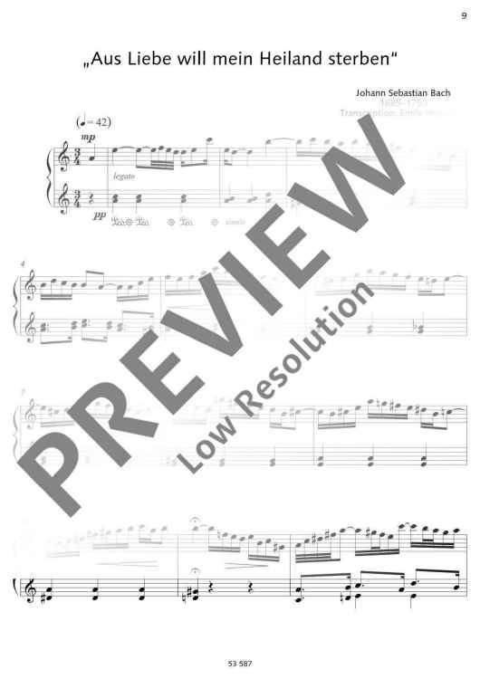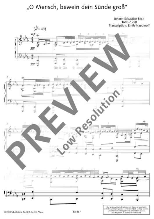 Bach transcriptions have always been popular for the musical brilliance of the Baroque master opens up a vast field, for composers and performers. Even the pianist and composer Emile Naoumoff who began his career at the age of 8, composed a piano concerto at the age of 10 and played it under the direction of Yehudi Menuhin is an expert and great admirer of Bach's music. The present edition contains no virtuoso 'fireworks music' but unites three slow, meditative pieces: 'O Mensch bewein dein Sünde groß' (Orgelbüchlein), the aria 'Aus Liebe will mein Heiland sterben' (St. Matthew's Passion), and the arioso 'Betrachte, meine Seel', mit ängstlichem Vergnügen' (St. John's Passion), demanding from the performer the pianistic realisation of subtle polyphony and the development of a very refined sound.