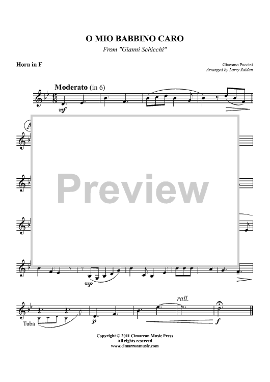 Digital Sheet Music for O Mio Babbino Caro - Horn in F by Giacomo Puccini, Larry Zaidan scored for Brass Quintet; id:427570