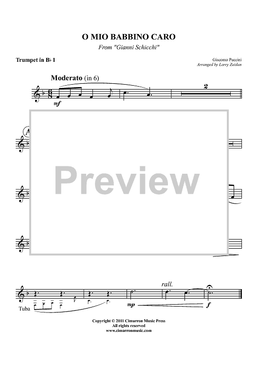 Digital Sheet Music for O Mio Babbino Caro - Trumpet 1 in Bb by Giacomo Puccini, Larry Zaidan scored for Brass Quintet; id:427568