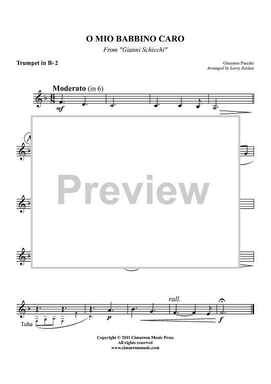 Digital Sheet Music for O Mio Babbino Caro - Trumpet 2 in Bb by Giacomo Puccini, Larry Zaidan scored for Brass Quintet; id:427569