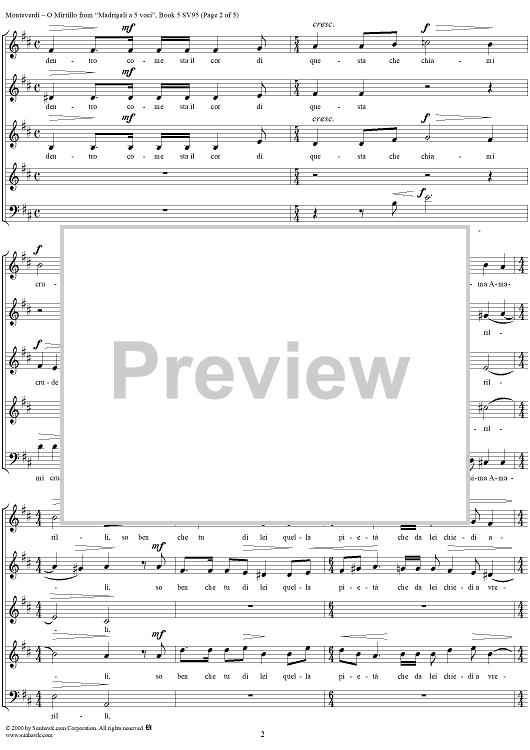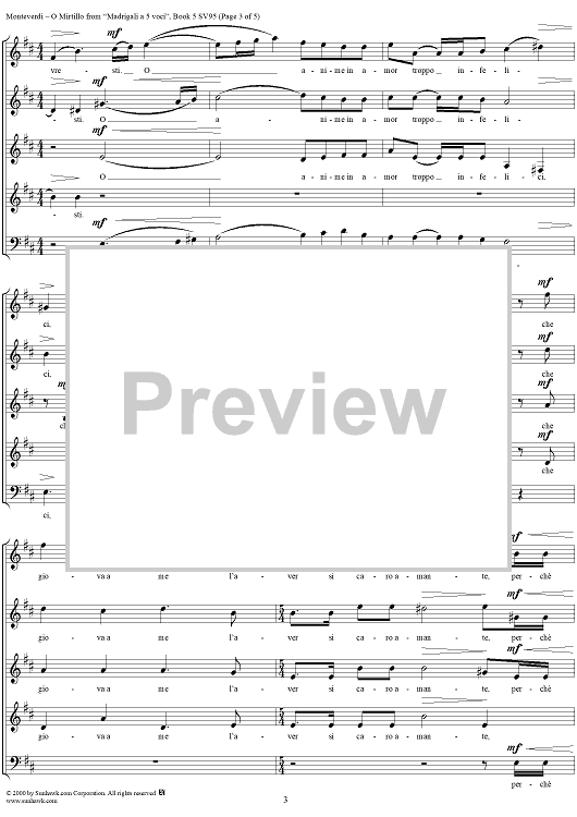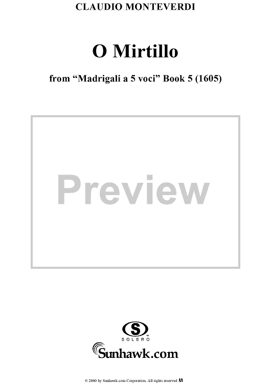 Digital Sheet Music for O Mirtillo - From "Madrigali à 5 voci" Book 5 (1605) - SV95 by Claudio Monteverdi scored for Four-part Mixed Chorus; id:253113