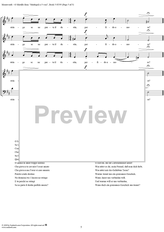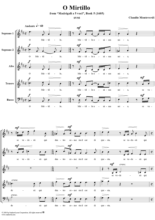 "O Mirtillo - From "Madrigali à 5 voci" Book 5 (1605) - SV95" Sheet Music by Claudio Monteverdi