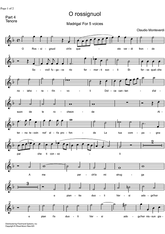 "O Rosignuol" Sheet Music by Claudio Monteverdi