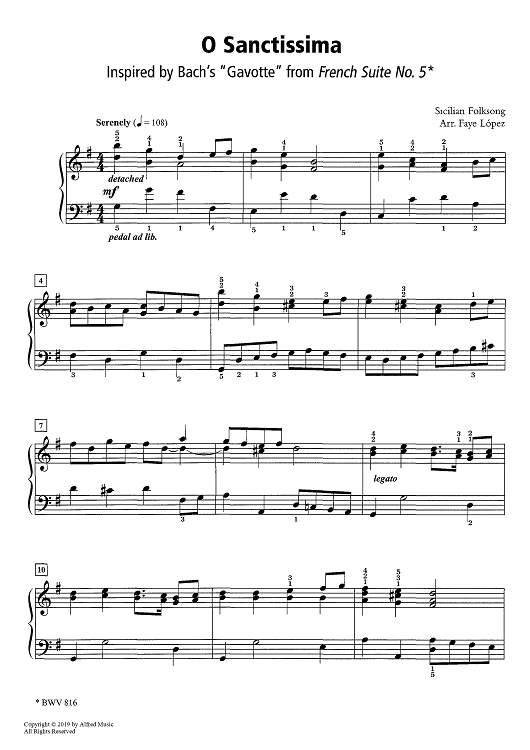Digital Sheet Music for O Sanctissima - Inspired by Bach's "Gavotte" from French Suit No. 5 by Faye López, Sicilian Folksong scored for Piano Solo; id:467928