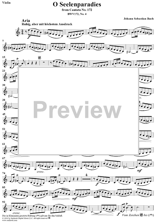 Digital Sheet Music for "O Seelenparadies", Aria, No. 4 from Cantata No. 172: "Erschallet, ihr Lieder" - Violin by Johann Sebastian Bach scored for Tenor, Violin or Viola and Piano or Organ; id:303985