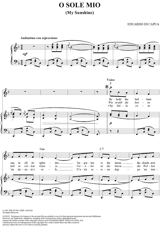 Digital Sheet Music for O Sole Mio by Eduardo di Capua, Michele Galdieri scored for Piano/Vocal/Chords; id:289439