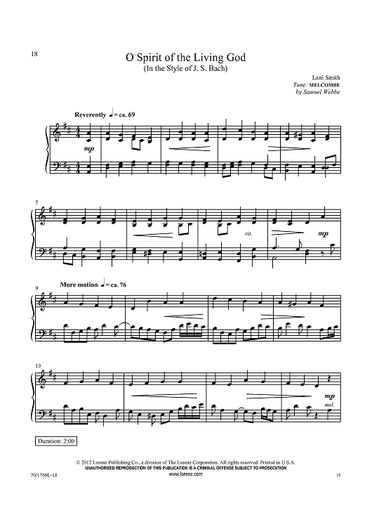 Digital Sheet Music for O Spirit of the Living God (In the Style of J. S. Bach) by Samuel Webbe, Lani Smith scored for Piano Solo; id:433586