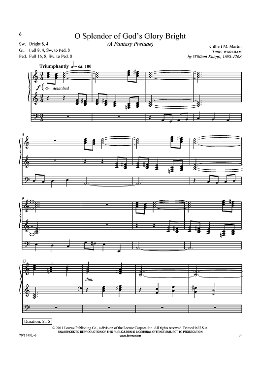 Digital Sheet Music for O Splendor of God’s Glory Bright by William Knapp, Gilbert M. Martin scored for Organ Solo; id:434676