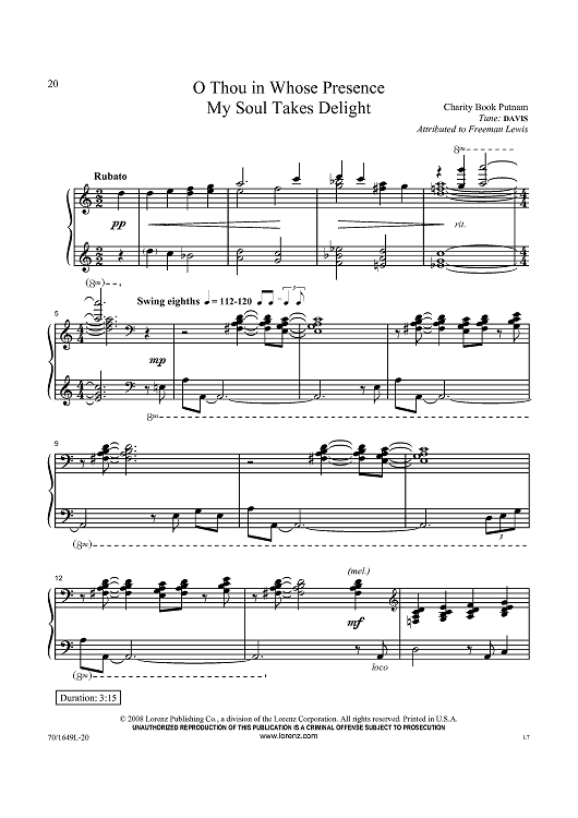 Digital Sheet Music for O Thou in Whose Presence My Soul Takes Delight by Charity Book Putnam, Freeman Lewis scored for Piano Solo; id:433943