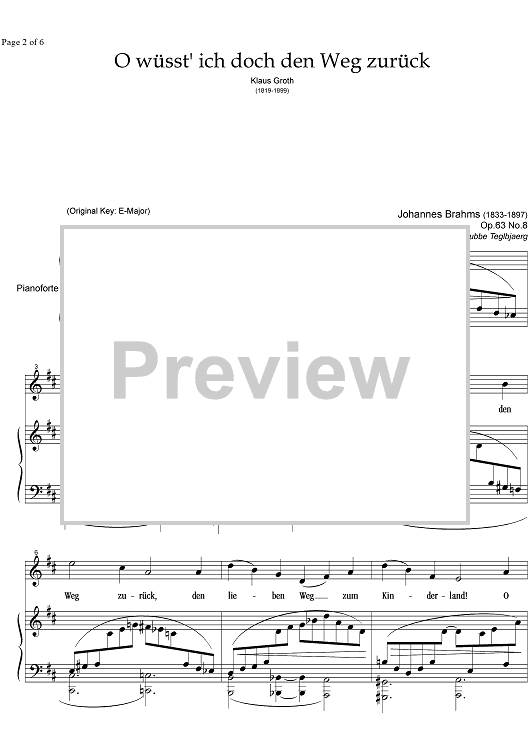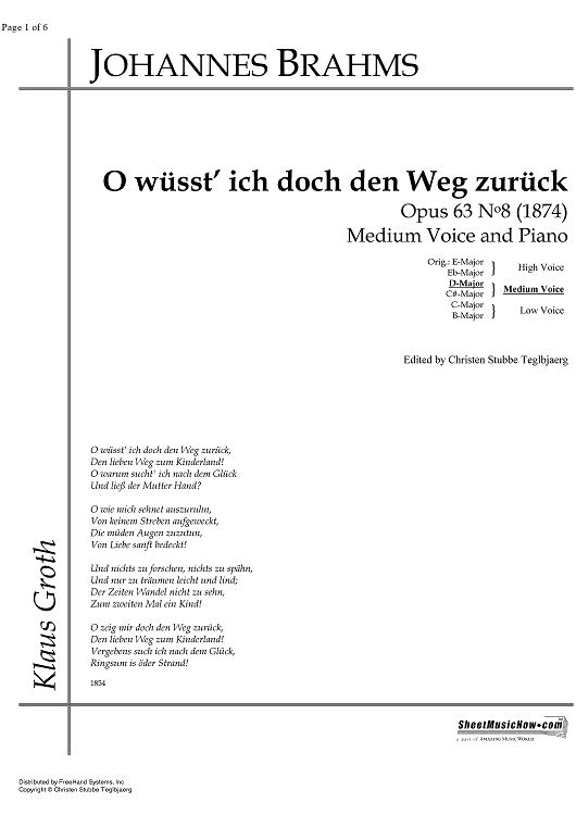 "O wüsst' ich doch den Weg zurück Op.63 No. 8" Sheet Music by Johannes Brahms
