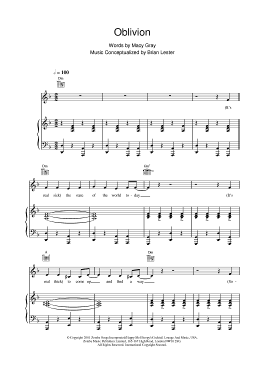 Digital Sheet Music for Oblivion by Macy Gray scored for Piano/Vocal/Chords; id:377460