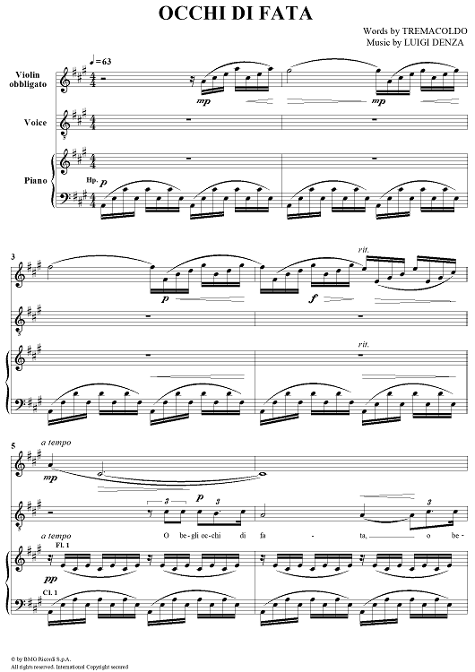 Digital Sheet Music for Occhi Di Fata by Andrea Bocelli, Tremacoldo, Luigi Denza scored for Piano/Vocal/Violin; id:296227