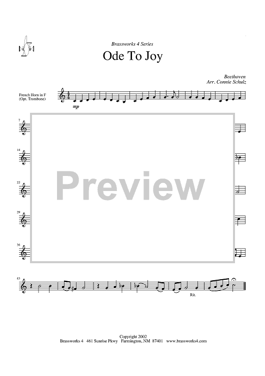 Digital Sheet Music for Ode to Joy - Horn in F by Ludwig van Beethoven, Connie Schulz scored for Brass Quartet; id:316735
