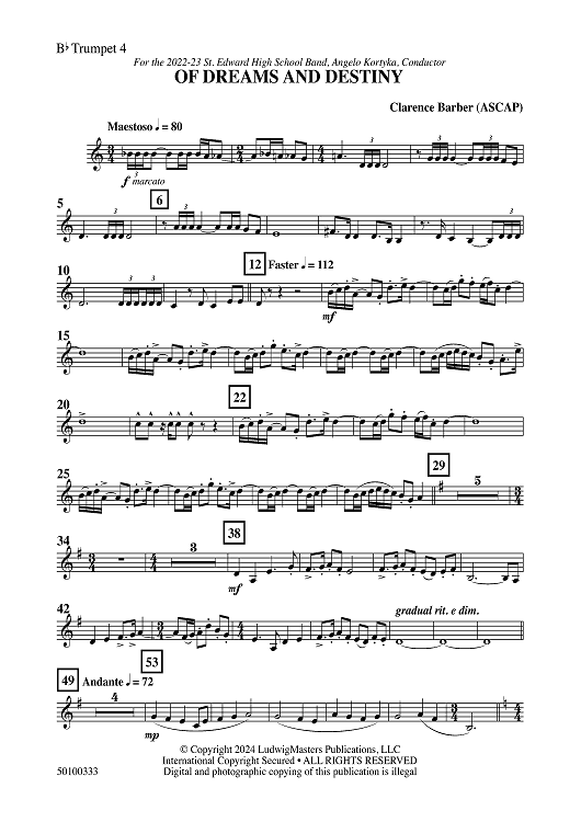 Digital Sheet Music for Of Dreams and Destiny - Bb Trumpet 4 by Clarence Barber scored for Concert Band; id:503826