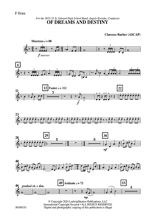 Digital Sheet Music for Of Dreams and Destiny - F Horn by Clarence Barber scored for Concert Band; id:503827