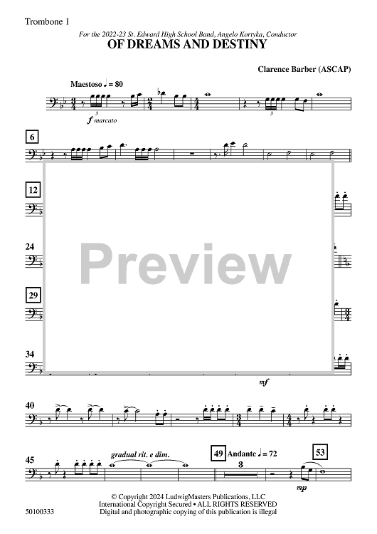 Digital Sheet Music for Of Dreams and Destiny - Trombone 1 by Clarence Barber scored for Concert Band; id:503828