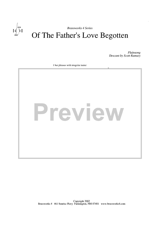 Digital Sheet Music for Of the Father's Love Begotten - Descant in B-flat by Scott A. Ramsey, Plainsong scored for Brass Quartet with Optional Descant; id:317156