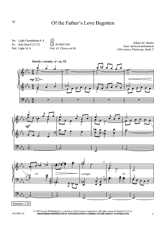 Digital Sheet Music for Of the Father’s Love Begotten by 13th-century plainsong melody, Gilbert M. Martin scored for Organ Solo; id:437837