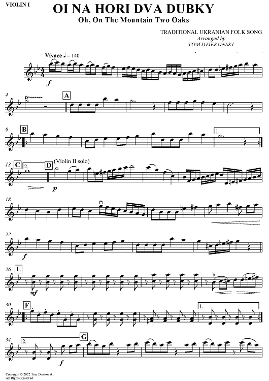 Digital Sheet Music for Oi Na Hori Dva Dubky (Oh, On The Mountain Two Oaks) - Violin 1 by Tom Dziekonski, Traditional Ukrainian Folk Song scored for String Quartet; id:497137