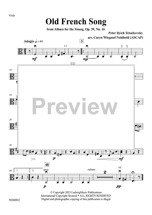 Digital Sheet Music for Old French Song - Viola by Peter Ilyich Tchaikovsky, Caryn Wiegand Neidhold scored for Solo String Instrument and String Orchestra; id:507717