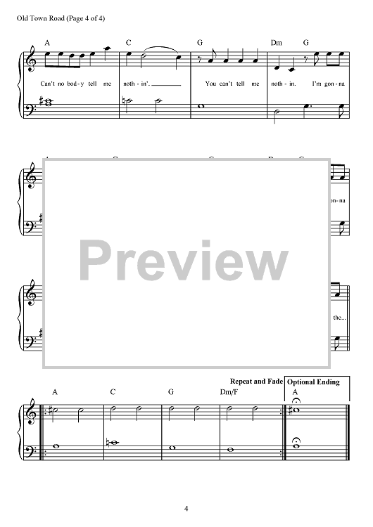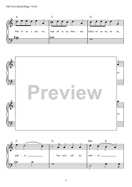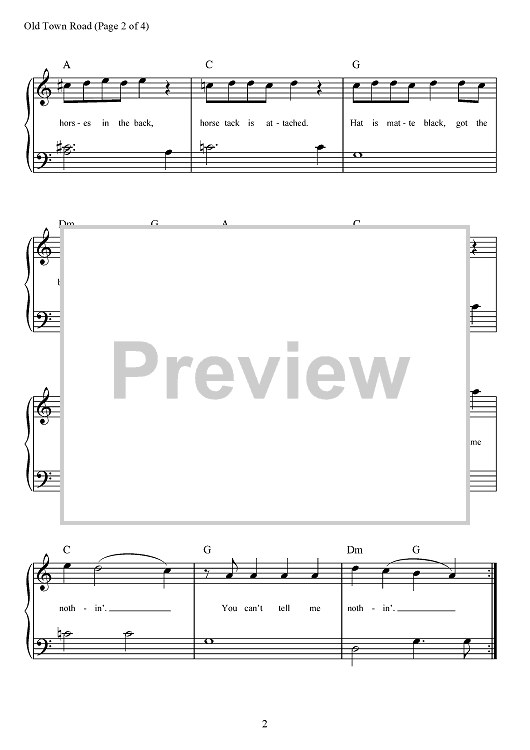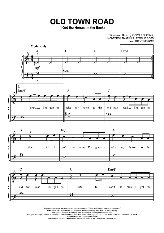 Digital Sheet Music for Old Town Road (I Got the Horses in the Back) by Trent Reznor, Kiowa Roukema, Montero Lamar Hill, Lil Nas X scored for Easy Piano/Vocal/Chords; id:467511