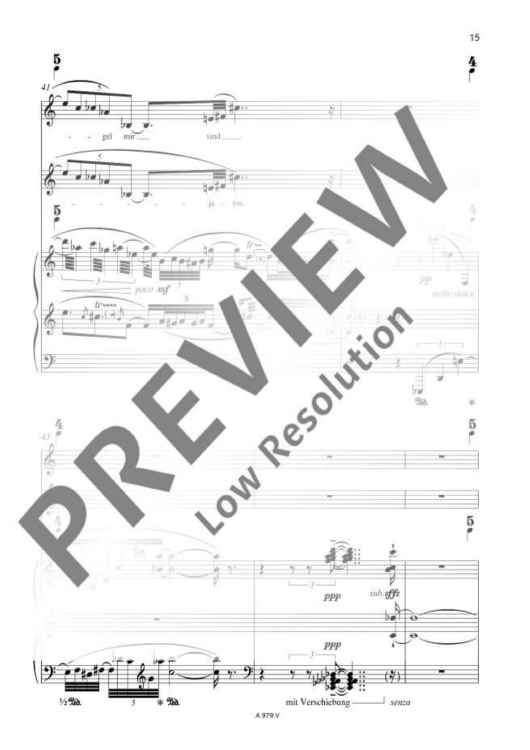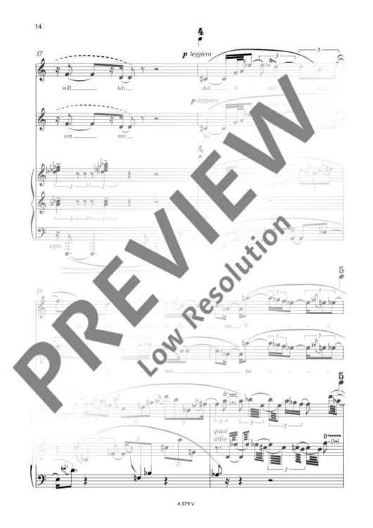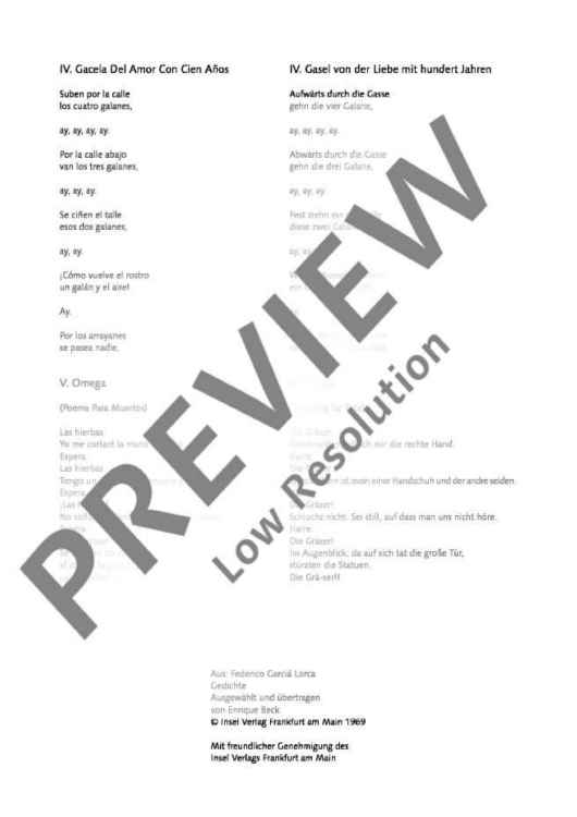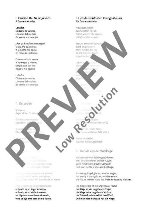 Fünf Lieder für Mezzosopran und Klavier nach Gedichten des spanischen Lyrikers Federico García Lorca, von expressiv bis elegisch. Texte auf Spanisch und Deutsch mit rhythmischer Anpassung an den jeweiligen Sprachduktus.
