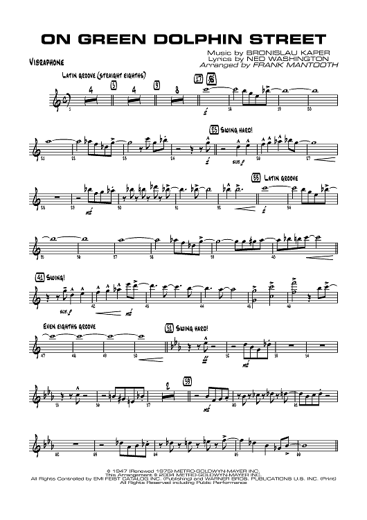 Digital Sheet Music for On Green Dolphin Street - Vibraphone by Ned Washington, Bronislau Kaper, Frank Mantooth scored for Jazz Ensemble; id:358957