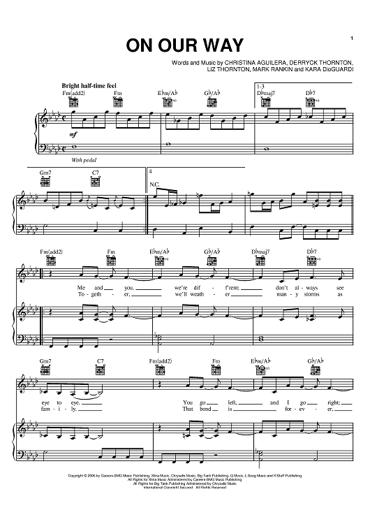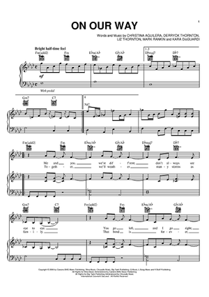 Digital Sheet Music for On Our Way by Kara DioGuardi, Mark Rankin, Derryck Thornton, Liz Thornton, Christina Aguilera scored for Piano/Vocal/Chords; id:401709