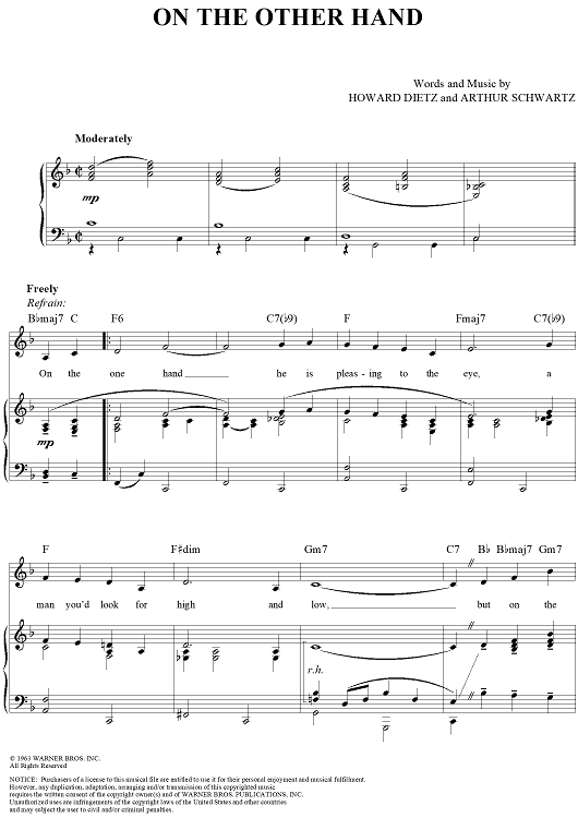 Digital Sheet Music for On the Other Hand by Howard Dietz, Arthur Schwartz scored for Piano/Vocal/Chords; id:315570